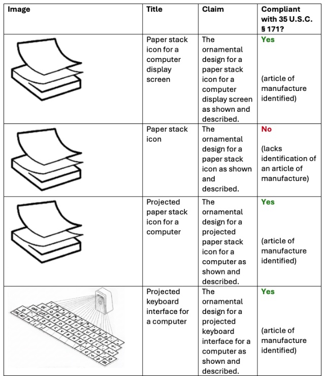 These highlighted types of eligible designs include projections and holograms for computers, computer displays, and computer systems where the appearance of the interfaces and icons is separate from the claimed computer, computer display, or computer system that generates it.