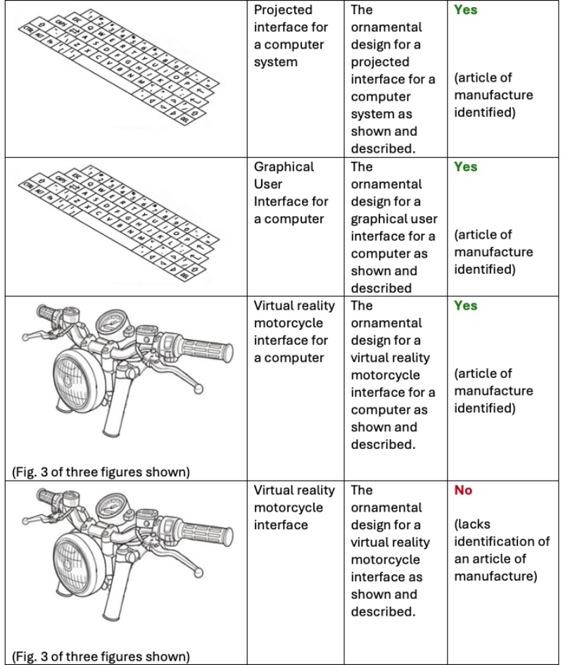 • A GUI displayed in virtual reality may be protectable, so long as it meets all the traditional requirements for image protection (e.g., the GUI must have a functional relationship to the article of the design).